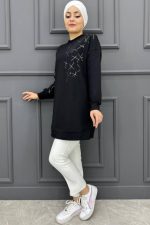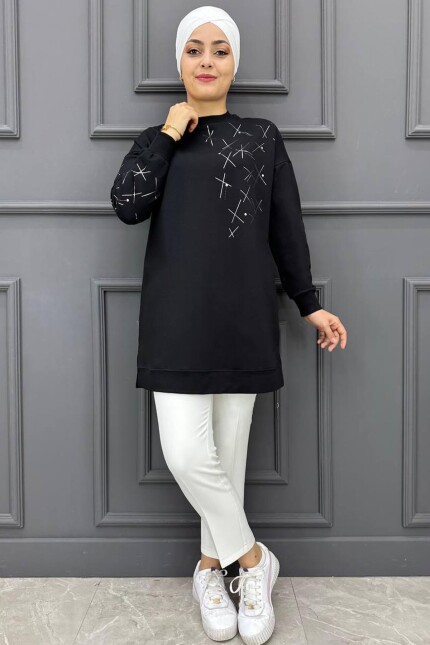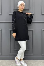 Kadın Baskı Ve Taş Detaylı Tesettür Tunik 23-SİYAH
