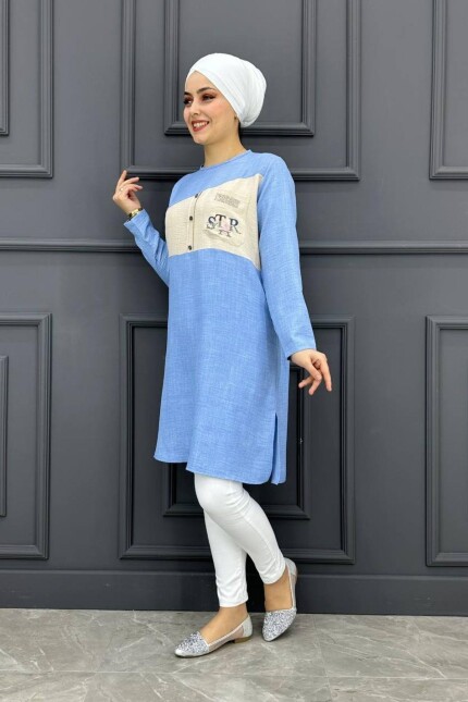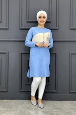 Kadın Baskı Ve Taş Detaylı Tesettür Tunik MDE24200244-080-Buz Mavisi
