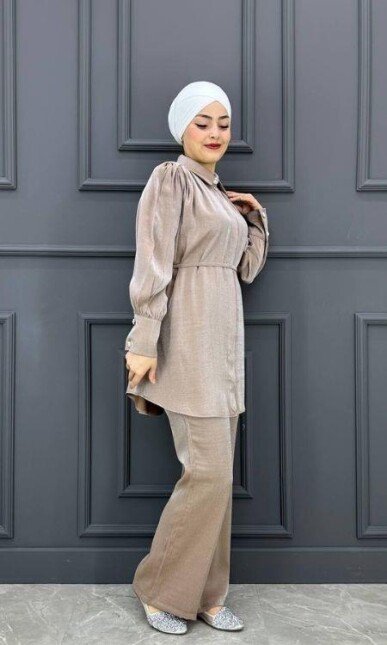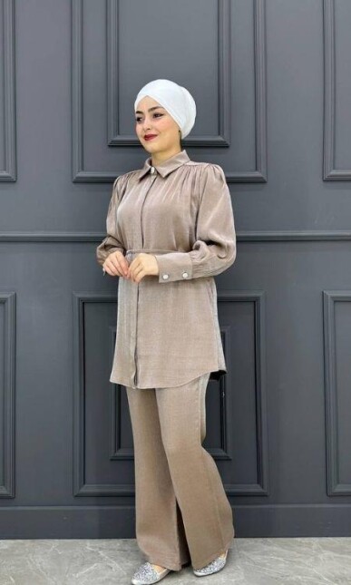 Kadın Broş Detaylı Simli Takım MRLY-10745-SÜTLÜ KAHVERENGİ