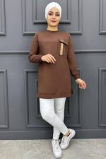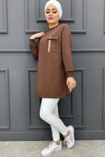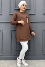 Kadın Cebi Kombin Ve Broş Detaylı Tesettür Tunik 51-KAHVERENGİ