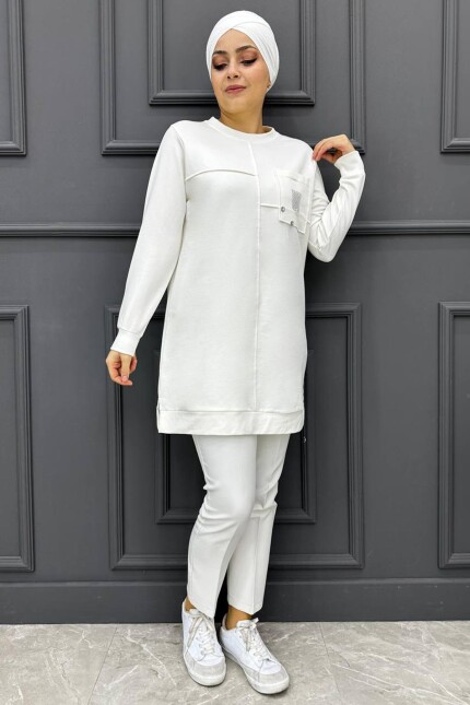 Kadın Cepli Ve Taş Detaylı Tesettür Tunik 280-EKRU