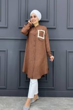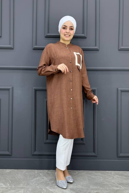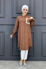 Kadın Kare Kombinli Keten Tesettür Gömlek MDE24210269-080-Kahverengi