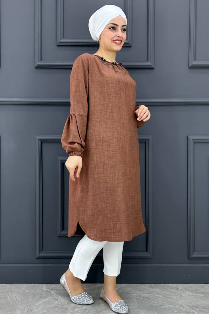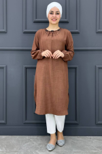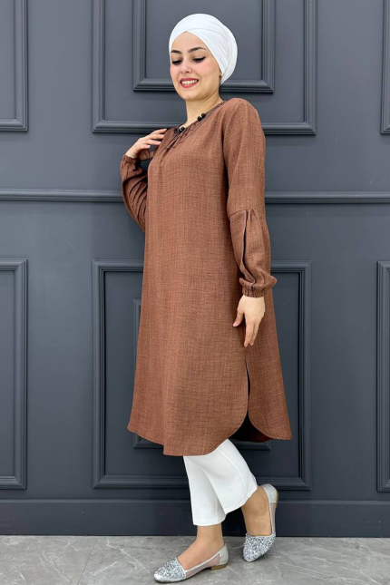 Kadın Kolları Dikim Ve Taş Detaylı Tesettür Tunik MDE24210455-080-Kahverengi