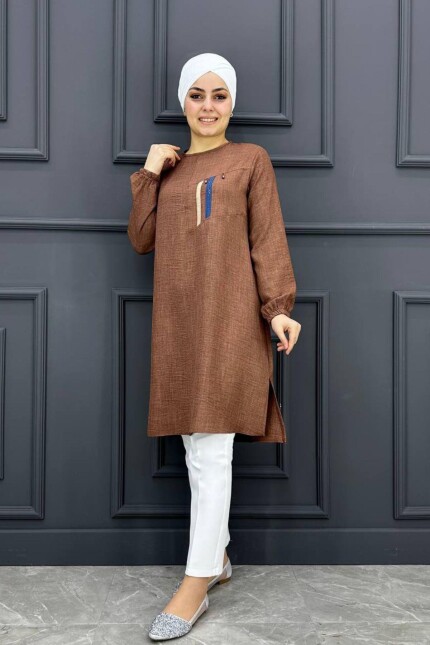 Kadın Kombin Üzeri Taş Detaylı Tesettür Tunik MDE24200234-080-Kahverengi