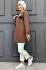 Kadın Cebi Kombin Ve Broş Detaylı Tesettür Tunik 51-KAHVERENGİ