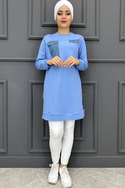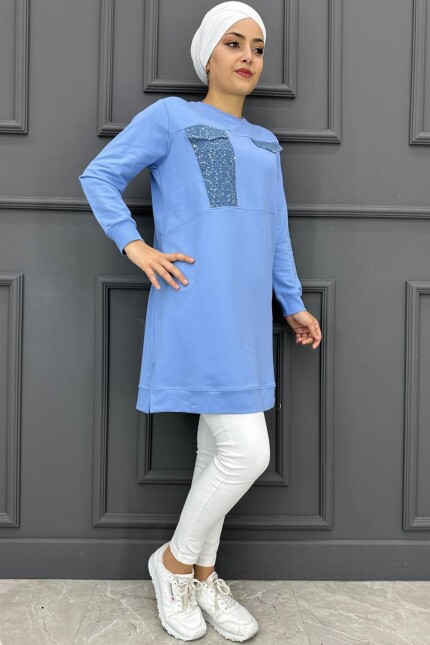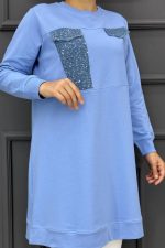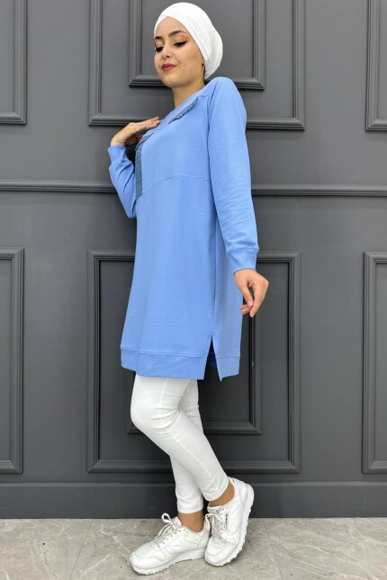 Kadın Baskı Ve Taş Detaylı Tesettür Tunik 23-MAVİ