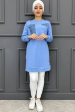 Kadın Kot Kombin Detaylı Tesettür Tunik 1-MAVİ