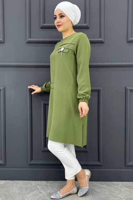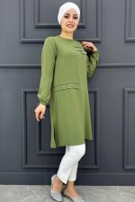 Kadın Nervür Kesim Broş Ve Taş Detaylı Tesettür Tunik MDE24200286-045-Haki