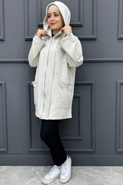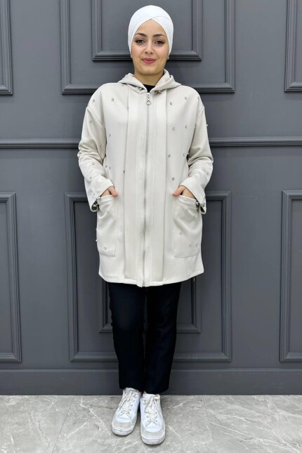 Kadın Önü Taşlı Fermuarlı Takım 131-BEJ