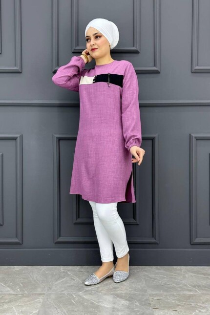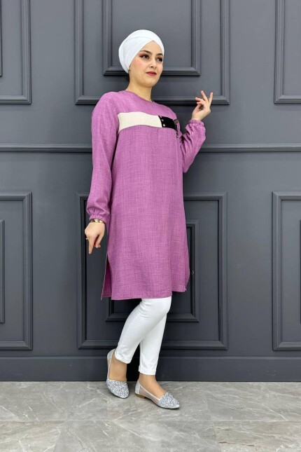 Tunik Özellikleri: Farklı kumaş detayı ile düğme ve aksesuar detaylı tunik modeli