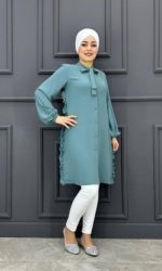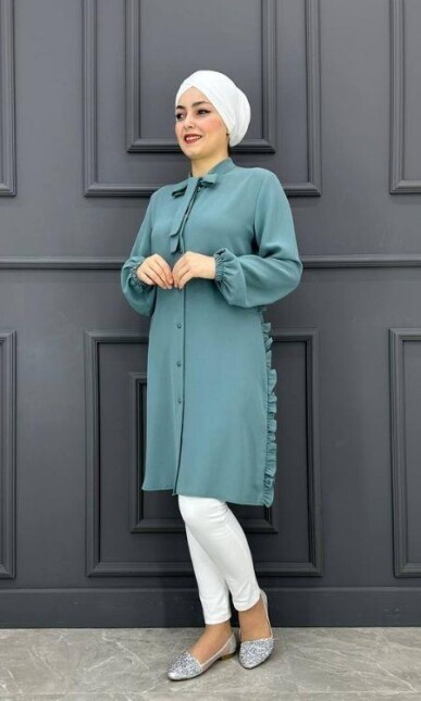 Kadın Yaka Bağlamalı Yandan Fırfırlı Tesettür Gömlek PFC-1539-MİNT YEŞİLİ