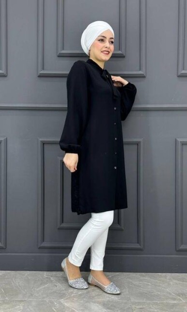 Kadın Yaka Bağlamalı Yandan Fırfırlı Tesettür Gömlek PFC-1539-SİYAH