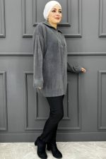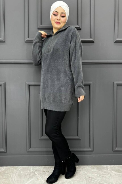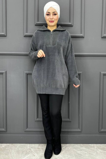 Kadın Yaka Fermuarlı Peluş Kazak 94-FÜME