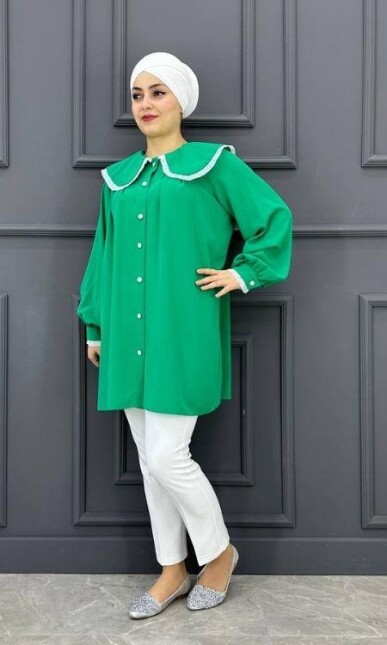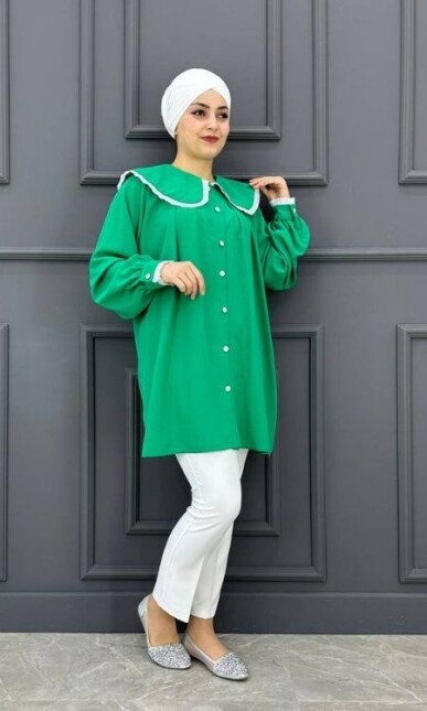 Kadın Yaka Ve Kol Dantel Detaylı Gömlek LMLF6355-YEŞİL